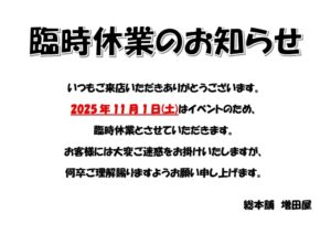 🙇♀️臨時休業のお知らせ🙇♀️ 2025.10.24 🙇♀️臨時休業のお知らせ🙇♀️ いつもご来店いただき誠にありがとうございます。 誠に勝手ながら、2025年11月1日(土)は イベントのため臨時休業とさせていただきます。 お客様には大変ご迷惑をお掛けいたしますが、 何卒ご理解賜りますようお願い申し上げます。